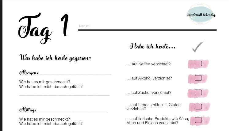 Druck Dir das Journal am besten aus und beantworte am Abend jedes einzelnen Detox Tages die Fragen ganz in Ruhe für Dich. Es wird Dir gut tun, Deinen Tag noch einmal Revue passieren zu lassen und festzustellen, wie toll Du Dich um Dich selbst und Deinen Körper gekümmert hast.